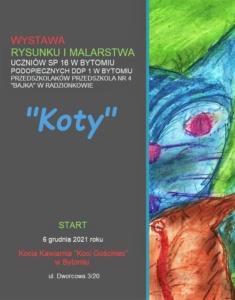 Serdecznie zapraszamy na wystawę rysunku i malarstwa Uczniów naszej szkoły, Podopiecznych DDP nr 1 w Bytomiu oraz Przedszkolaków z Przedszkola nr 4 „Bajka” w Radzionkowie pt. „Koty”, która odbędzie się 6 grudnia 2021 roku w Kociej Kawiarni „Koci Gościniec” w Bytomiu (ul. Dworcowa 3/20).