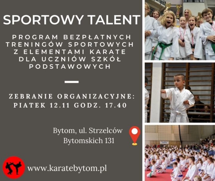 Zebranie organizacyjne dla opiekunów osób chętnych do udziału w programie odbędzie się w piątek 12.11 o godzinie 17.40 w Hali przy ulicy Strzelców Bytomskich 131. Więcej informacji na www.karatebytom.pl oraz pod numerem telefonu: 723-908-771.