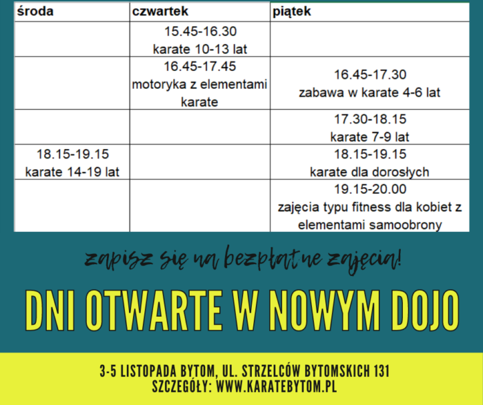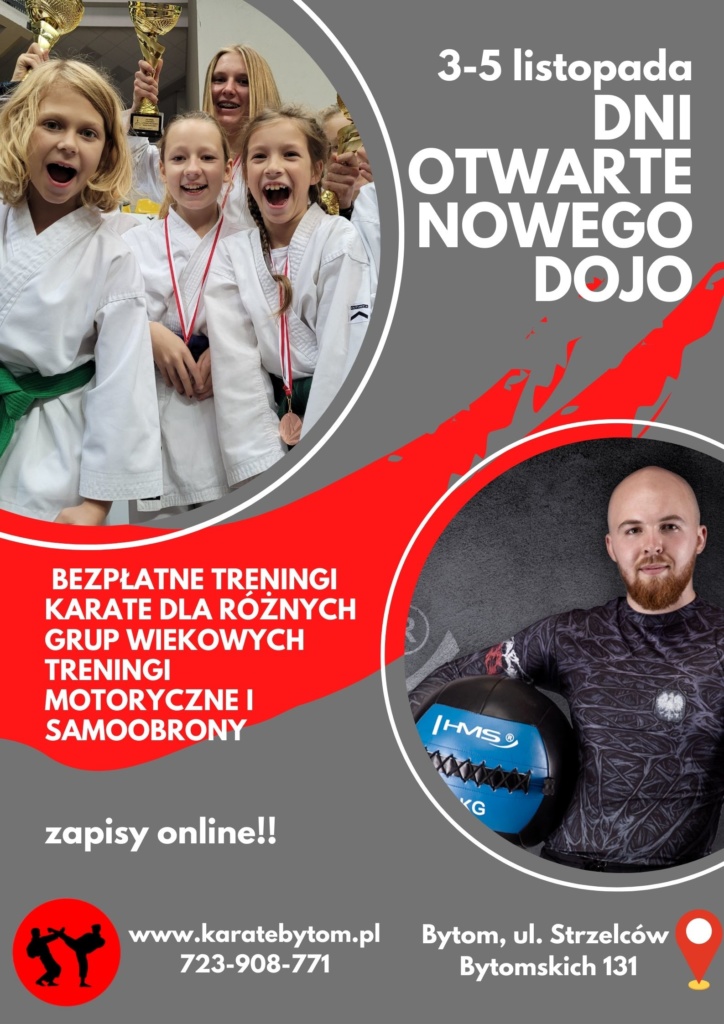 W czwartek 28 października miało miejsce niezwykle miłe wydarzenie.Dzięki uprzejmości Miasta Bytom klub karate tradycyjnego będzie miał w pełni profesjonalną salę! W dniach 3-5 listopada odbędą się dni otwarte nowego dojo, podczas których bezpłatnie będzie można uczestniczyć w treningach karate dla różnych grup wiekowych, treningach motorycznych czy zajęciach skierowanych specjalnie do pań. Ze względu na ograniczoną ilość miejsc w grupach obowiązują zapisy online – szczegóły na www.karatebytom.pl